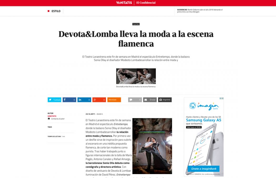 El Teatro Laraestrena este fin de semana en Madrid el espectáculo Entretiempo, donde la bailaora Sonia Ollay el diseñador Modesto Lombadesarrollan la relación entre moda y flamenco. Por primera vez un desfile sirve de inspiración para subirlo al escenario en una inédita propuesta flamenca, de corte tan moderno como purista…El Confidencial