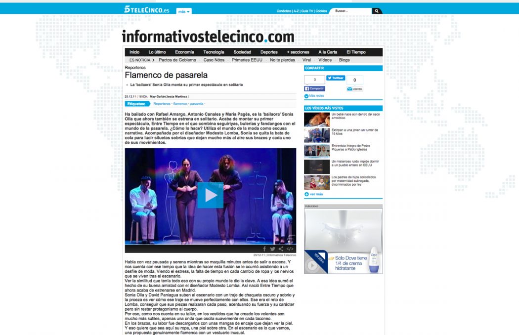 Ha bailado con Rafael Amargo, Antonio Canales y María Pagés, es la ‘bailaora’ Sonia Olla que ahora también se estrena en solitario. Acaba de montar su primer espectáculo, Entre Tiempo en el que combina seguiriyas, bulerías y fandangos con el mundo de la pasarela. ¿Cómo lo hace? Utiliza el mundo de la moda como excusa narrativa…Informativos Tele 5