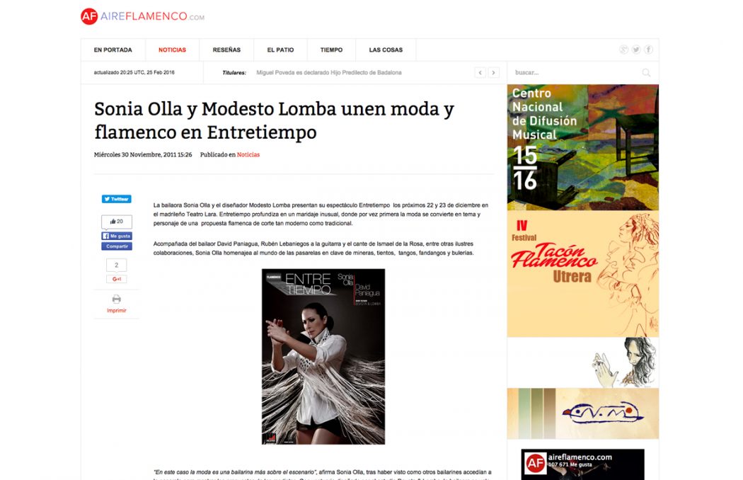 La bailaora Sonia Olla y el diseñador Modesto Lomba presentan su espectáculo Entretiempo los próximos 22 y 23 de diciembre en el madrileño Teatro Lara. Entretiempo profundiza en un maridaje inusual, donde por vez primera la moda se convierte en tema y personaje de una propuesta flamenca de corte tan moderno como tradicional…AireFlamenco.com
